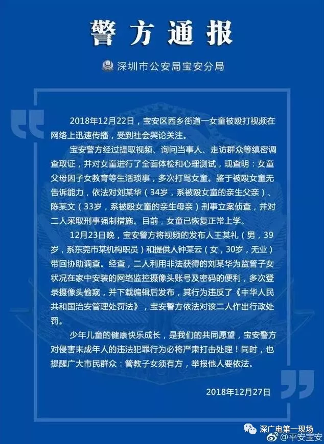 12月27日晚19時(shí)許深圳警方通報(bào)“父母虐童”案處理結(jié)果:女童父母被采取刑事強(qiáng)制措施 視頻發(fā)布人被行政處罰