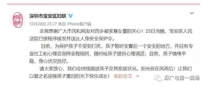 而在稍早前的12月24號(hào),寶安西鄉(xiāng)街道辦發(fā)布的情況通報(bào):寶安區(qū)人民法院于23號(hào)晚已經(jīng)簽發(fā)人身安全保護(hù)令,目前已經(jīng)送達(dá)當(dāng)事人及轄區(qū)派出所。
