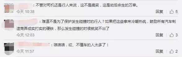 也有網(wǎng)友表示:"不管對(duì)司機(jī)還是行人來(lái)說(shuō),這不是搞笑,這是劫后余生的萬(wàn)幸""防撞效果很好啊,本身就是要緩沖的""塑料懟鋼圈不就這樣?""難道不是為了保護(hù)發(fā)生碰撞時(shí)的行人?"。