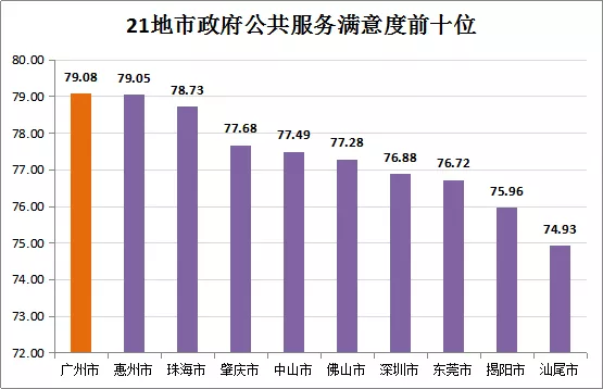 珠三角地區(qū)公共服務滿意度得分最高(77.14分),其次為粵東地區(qū)(74.55分)、粵北地區(qū)為69.79分;粵西地區(qū)得分最低,為68.34分。在21個地級以上市中,有15個地市政府公共服務總體滿意度超過70分,占全省21個地市的71.43%;總體滿意度較高的前五位依次為廣州市、惠州市、珠海市、肇慶市、中山市,均為珠三角區(qū)域城市;粵東西北滿意度較高的前五位地市依次為揭陽市、汕尾市、汕頭市、清遠市、潮州市。值得注意的是,廣州十年來首次躍居全省政府公共服務滿意度第一位,作為國家中心城市,公眾的期望一直較高,取得如此成績,反映出廣州在公共服務建設上取得了長足的進步。