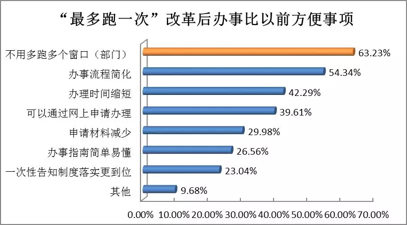 86.69%的受訪者認為“最多跑一次”改革實施后到政府辦事比以前更方便了,方便事項排在第一位的是“不用多跑多個窗口(63.23%),其次依次為辦事流程簡化(54.34%)、辦理時間縮短(42.29%)。