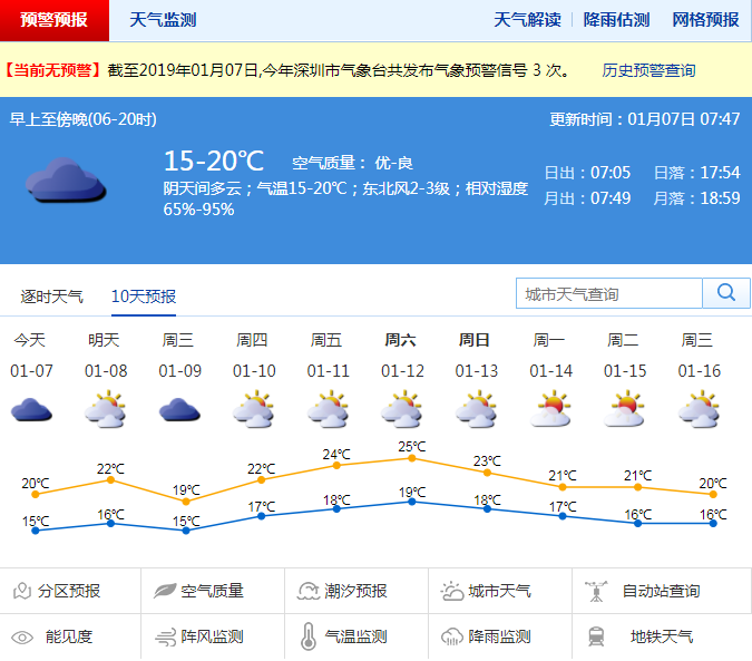 深圳新聞網1月7日訊(記者 陳婕)記者從深圳市氣象局了解到,周一到周三受弱冷空氣影響,云量較多,偶有零星小雨,氣溫小幅波動,7日氣溫15-20℃;周四到周六日多云間陰天,可見陽光,氣溫上升,早晚能見度較差;周日受弱冷空氣影響,氣溫略降。