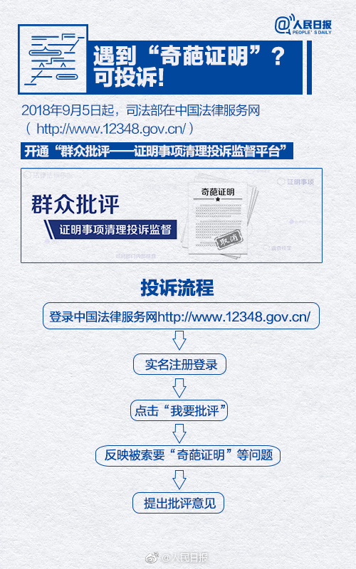 遇到這樣的"奇葩證明"可在司法部開通的網(wǎng)上投訴平臺上進(jìn)行投訴,實(shí)名登錄后即可反映意見,各地方被要求在15天內(nèi)反饋。