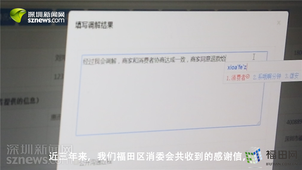 福田區(qū)消委會(huì)工作人員在315投訴平臺上填寫調(diào)解結(jié)果。