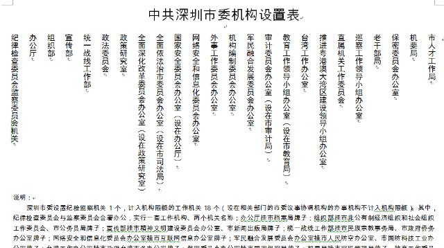 ①近日,《深圳市機(jī)構(gòu)改革方案》經(jīng)省委、省政府批準(zhǔn),并報中央備案同意。1月8日至9日,市委召開六屆十一次全會,對全市深化機(jī)構(gòu)改革工作作出全面部署,我市機(jī)構(gòu)改革工作進(jìn)入全面實施階段。深圳市委設(shè)置紀(jì)檢監(jiān)察機(jī)關(guān)1個,計入機(jī)構(gòu)限額的工作機(jī)關(guān)18個(設(shè)在相關(guān)部門的市委議事協(xié)調(diào)機(jī)構(gòu)的辦事機(jī)構(gòu)不計入機(jī)構(gòu)限額)。深圳市人民政府設(shè)置工作部門34個。詳情請看>>
