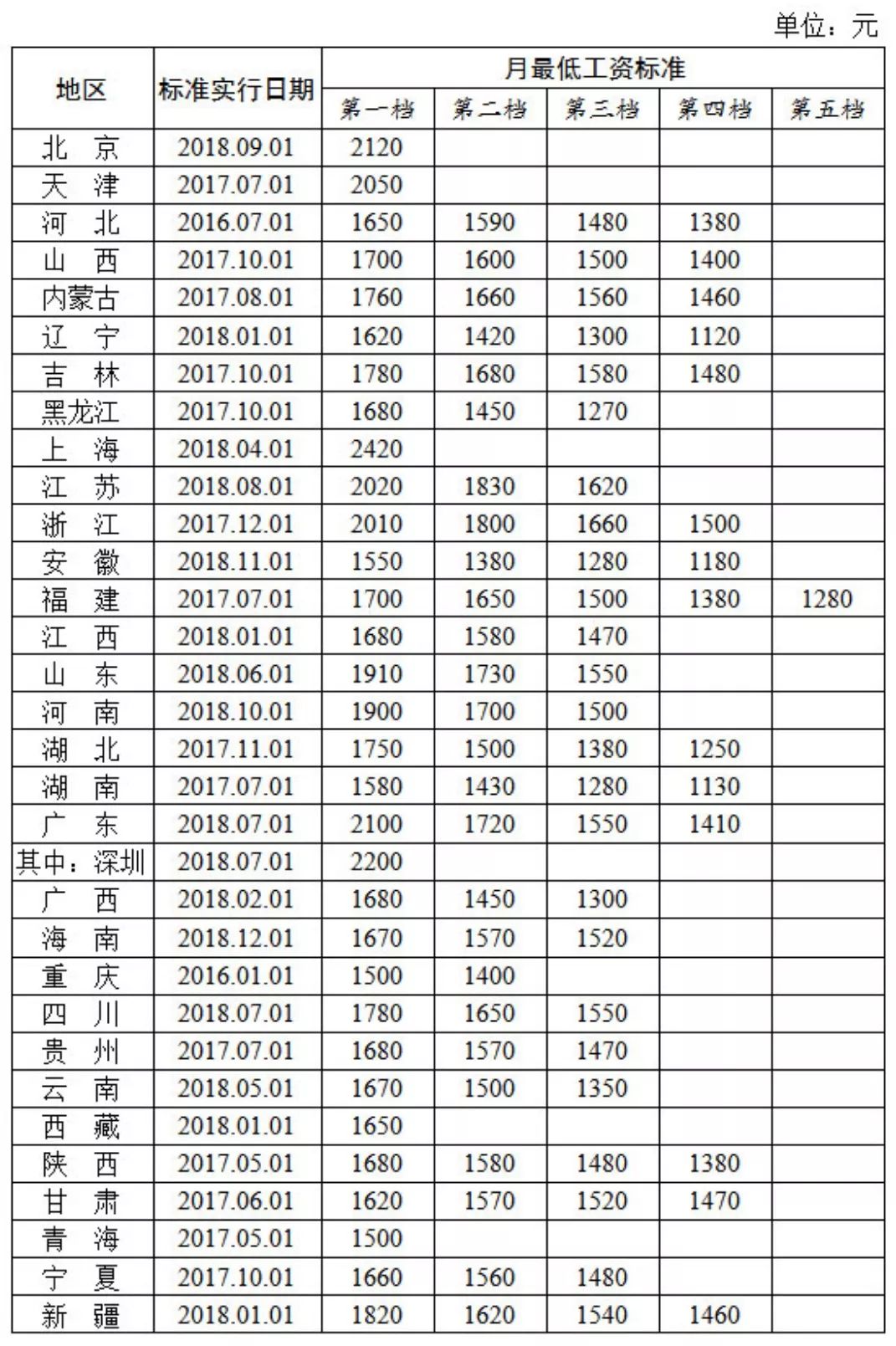 ①人社部10日公布全國各地區(qū)月最低工資標(biāo)準(zhǔn)情況(截至2018年12月),其中,上海月最低工資標(biāo)準(zhǔn)達(dá)到2420元,為全國最高。上海、廣東、北京、天津、江蘇、浙江這6個省份月最低工資標(biāo)準(zhǔn)超過2000元。(深圳最低工資標(biāo)準(zhǔn)已于2018年8月1日起調(diào)整,全日制就業(yè)勞動者最低工資標(biāo)準(zhǔn)為2200元/月,非全日制就業(yè)勞動者小時最低工資標(biāo)準(zhǔn)為20.3元/小時。)