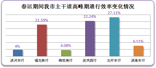 經(jīng)對我市城區(qū)主干道高峰期車流量監(jiān)測,預計春運期間我市早晚高峰道路日趨順暢,全市各條主干道及進出關(guān)道路平均通行效率提高一成,北環(huán)東行、泥崗路西行行車效率提升最為明顯。