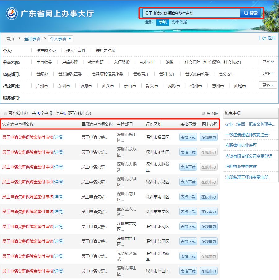 答:員工登錄廣東省網(wǎng)上辦事大廳官網(wǎng),點(diǎn)擊“個人事項”,在搜索欄中輸入“員工申請欠薪保障金墊付審核”,可查詢到各區(qū)“員工申請欠薪保障金墊付審核”事項,選擇所在區(qū)點(diǎn)擊“詳情”,即可查詢到所在區(qū)人力資源部門的咨詢電話、辦理地址、辦理時間和交通指引等相關(guān)信息。
