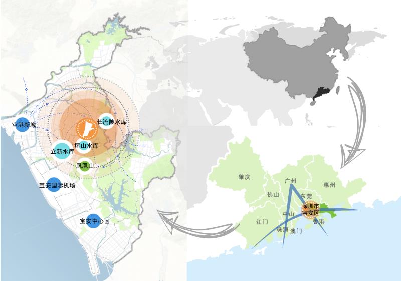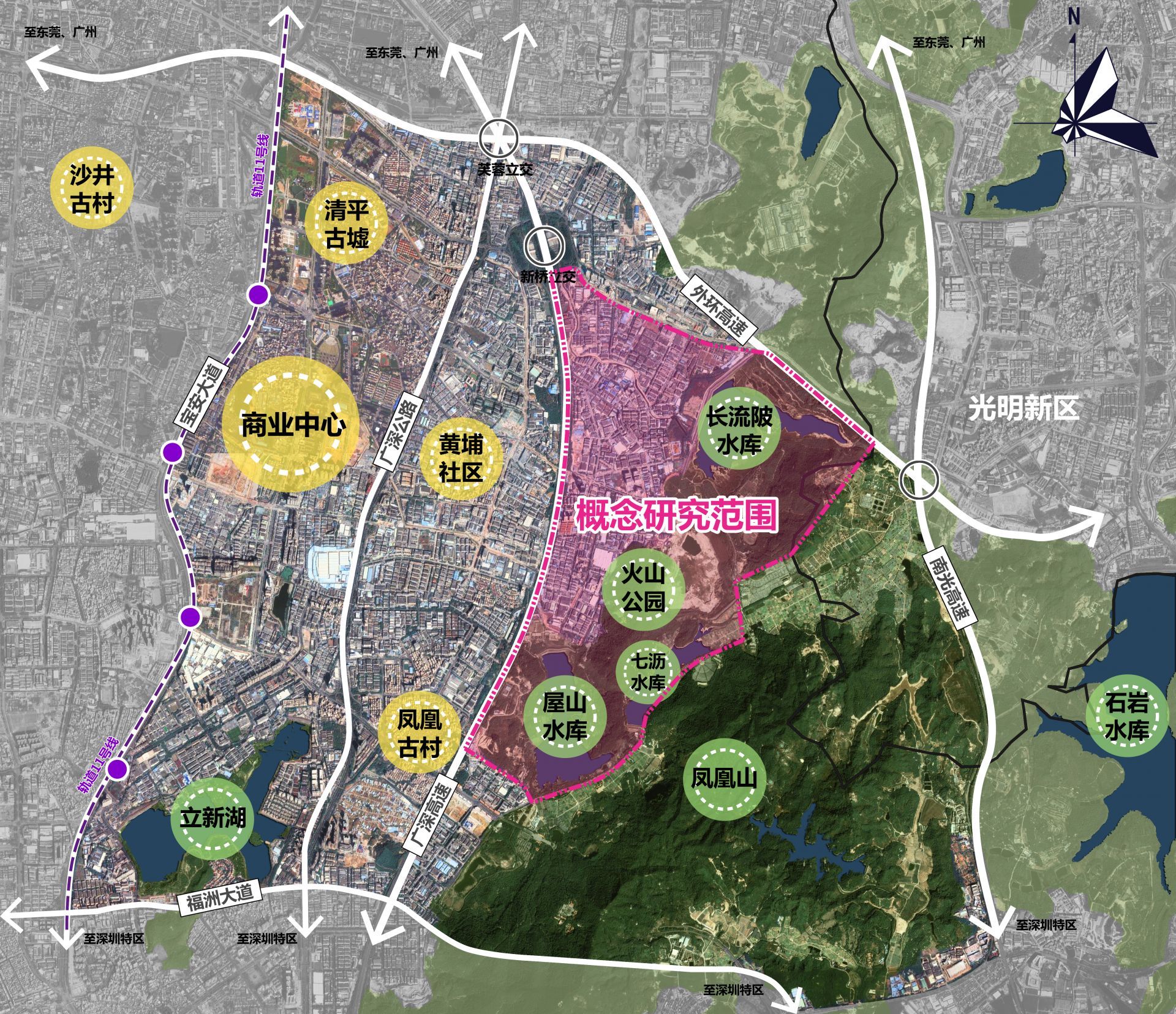 概念規(guī)劃范圍包含詳細(xì)設(shè)計(jì)范圍在內(nèi)的周?chē)P(guān)聯(lián)緊密地區(qū),用地約10平方公里,北至新玉路和外環(huán)高速,西至廣深高速,南至鳳凰第二工業(yè)區(qū),東部為包含“三庫(kù)一園”(屋山水庫(kù)、長(zhǎng)流陂水庫(kù)、七瀝水庫(kù)及火山公園)在內(nèi)關(guān)聯(lián)緊密的自然山體、水等要素。