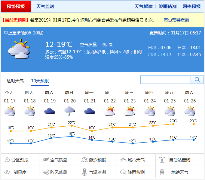市氣象臺(tái)還發(fā)布2019年春運(yùn)天氣趨勢(shì),預(yù)計(jì)今年春運(yùn)天氣影響與去年相當(dāng),未來45天有3次冷空氣過程,分別出現(xiàn)在1月21日、26日和2月1日 -2日前后,深圳最低氣溫10 ℃左右,天氣陰冷伴有大風(fēng),同期南方有階段性雨雪冰凍天氣。2月4日 -2月10日,無強(qiáng)冷空氣影響我市。