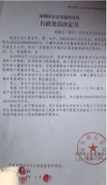 1月14日21時(shí)30分,福田區(qū)福田村崗邊坊27棟1樓發(fā)生火災(zāi)事故,因處置及時(shí),事故未造成人員傷亡和財(cái)產(chǎn)損失。經(jīng)消防部門現(xiàn)場(chǎng)勘查認(rèn)定:火災(zāi)是由于違法行為人房某將回收的廢棄電池、手機(jī)屏等電子配件隨意堆放在靠窗貨架上,電池故障引燃周圍物品導(dǎo)致。福田派出所依法對(duì)房某處以行政拘留十天。