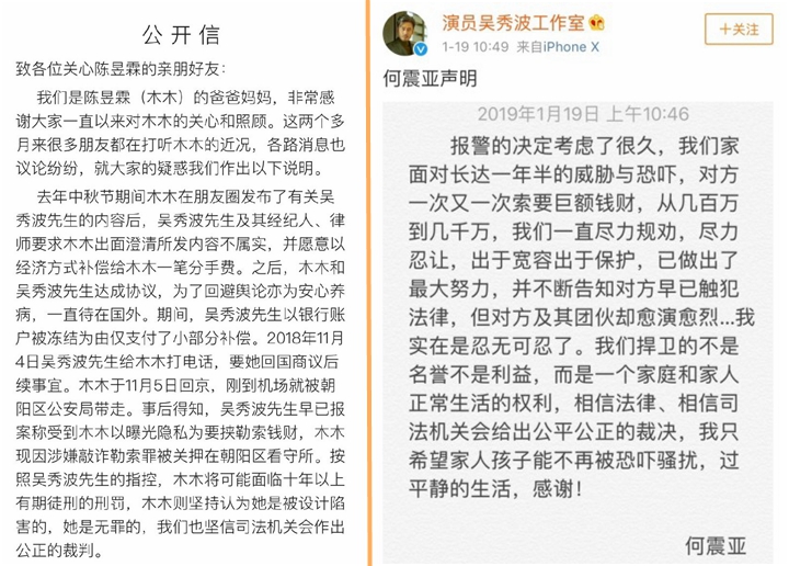 深圳新聞網(wǎng)1月22日訊(記者 張玲)近日,演員吳秀波婚內(nèi)出軌事件再度發(fā)酵在微博引發(fā)熱搜,而這次事件的主角則是之前銷聲匿跡已久的陳昱霖(藝名)。2019年1月18日,陳昱霖父母微博公開發(fā)表聲明稱女兒被吳秀波欺騙回國后,吳秀波以“曝光隱私威脅勒索錢財(cái)”為由報警,女兒在下飛機(jī)后即被警方抓捕。隨后,吳秀波妻子何震亞發(fā)表聲明反擊,稱陳昱霖多次威脅索要巨額財(cái)務(wù),數(shù)額一度高達(dá)千萬,在忍無可忍的情況下才選擇報警,希望通過司法途徑維護(hù)自己的權(quán)益。