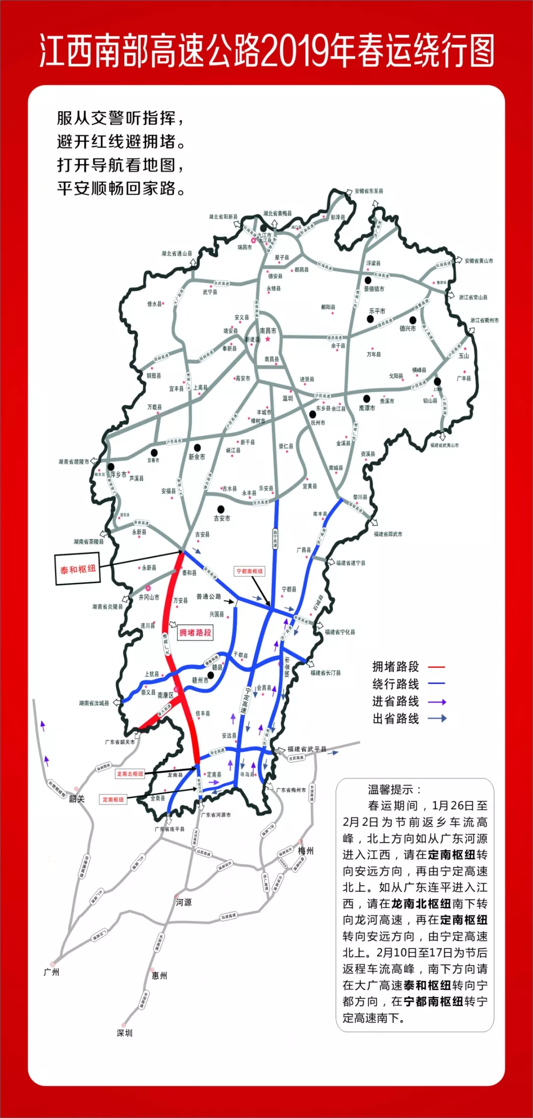 春運(yùn)高峰時(shí)段,樂廣高速花山互通立交段有一定概率產(chǎn)生擁堵,建議旅客根據(jù)實(shí)時(shí)路況選擇武深高速或京珠高速繞行。