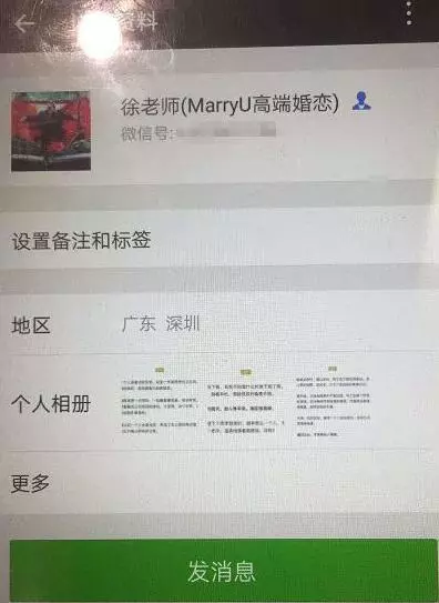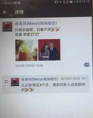 沒想到半個月之后,陳先生的朋友發(fā)現(xiàn),他的結(jié)婚照出現(xiàn)在了一個婚戀公司員工的朋友圈里。陳先生告訴記者,這個員工轉(zhuǎn)發(fā)他的照片同時還在上面評論寫上“認(rèn)識到領(lǐng)證四個月,遇到對的人還是挺快的”。