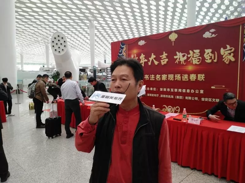 寶安區(qū)書法家協(xié)會(huì)主席李高揚(yáng)介紹,在機(jī)場(chǎng)送春聯(lián)很有意義,可以給全國(guó)各地的朋友們送上新年祝福。這次深圳發(fā)布廳攜手深圳機(jī)場(chǎng)舉辦活動(dòng),寶安區(qū)書法家協(xié)會(huì)集結(jié)高手出動(dòng)為群眾服務(wù),為市民送去祝福。他祝大家新春快樂(lè),闔家幸福。