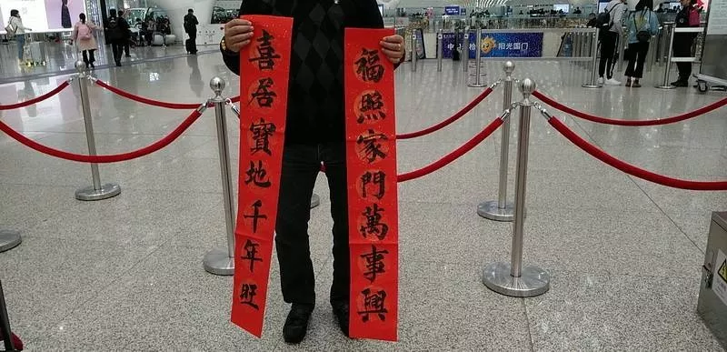 宋先生當(dāng)天10:50的飛機出發(fā)去上海再轉(zhuǎn)機回老家山東,他選擇了“人和家順百事興,富貴平安福滿堂”橫批“家和業(yè)興”,一個個“家”“安”“和”等字樣表達了他的新年愿望:希望家人平平安安。