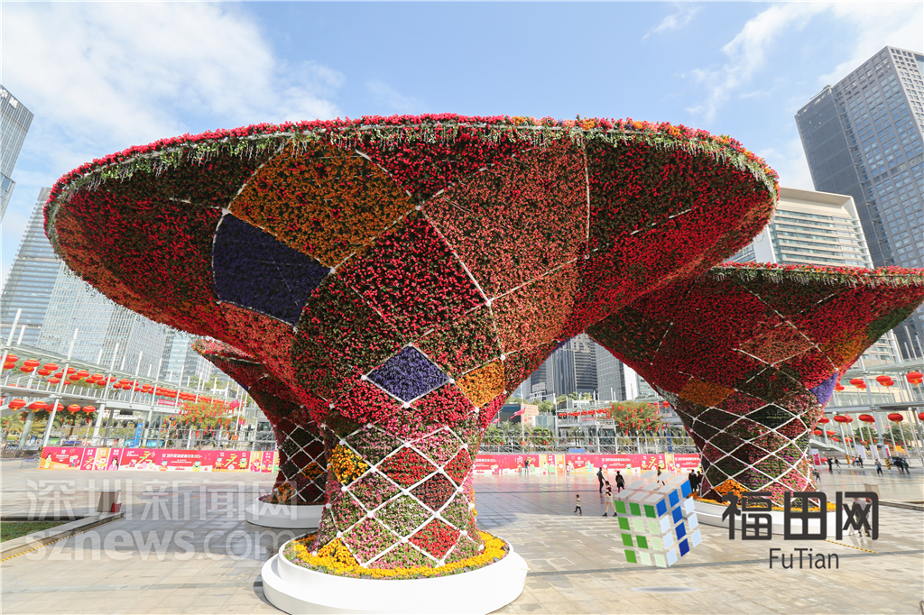 在會(huì)展中心門口,首先映入眼簾的便是一座高15米,寬40米的迎春花市門樓。記者了解到,該門樓本身就是一件花卉藝術(shù)作品,主題為——花開鵬城。以盛開抽象的花形為設(shè)計(jì)元素,采用流暢的交織曲線并結(jié)合七彩花卉,打造一種花開鵬城的韻味,突出迎春花市的氣息。