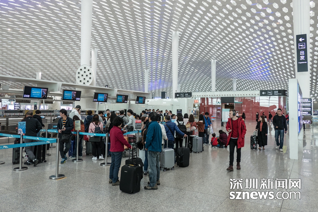 2月3日10:15,寶安機場出發(fā)大廳,旅客正在辦理行李托運手續(xù)(實習 生關(guān)天宇攝)