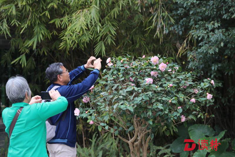 大年初五,天氣溫暖舒適,園博園里的游客一撥接一撥。也許是對中式傳統(tǒng)風(fēng)格的青睞,被茶花展吸引的客流中有不少中老年游客。"天氣好,花也美,美好的景色人人愛看,人老了心還沒老,也過來賞賞花拍拍照,高興?。⒛杲呤耐醢⒁谭浅i_心地說。