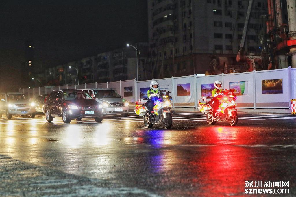 在深圳交警鐵騎帶領下,社會車輛有序通過黃木崗十字路口