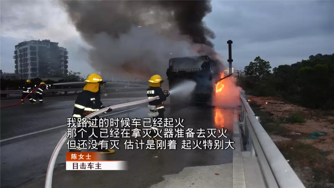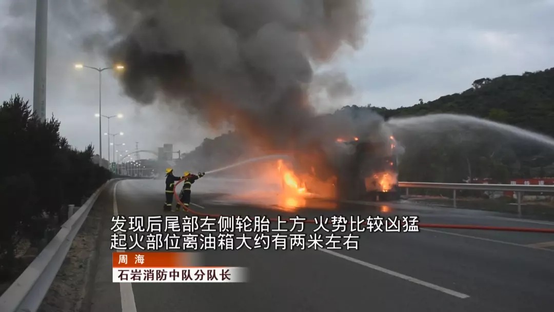 由于陳小姐及時報警,石巖消防中隊官兵在起火不久后便到達現(xiàn)場。到場后,消防立即要求還在救火的兩名司機撤離。