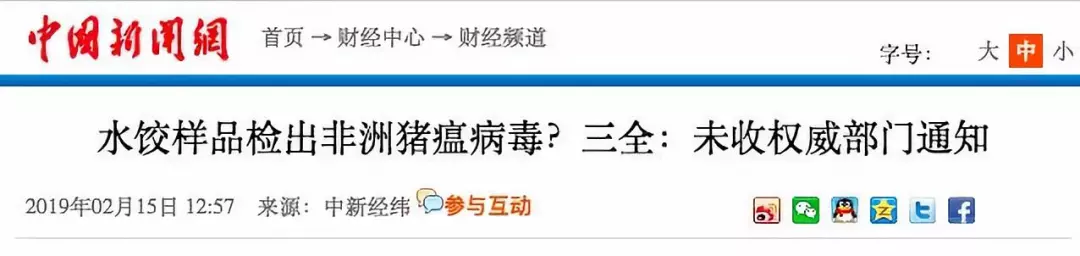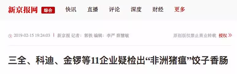 據(jù)紅星新聞報道,多家媒體稱,2月9日,湖南省湘西自治州重大動物疫病防制指揮部辦公室接到省防治重大動物疫病指揮部辦公室通知,要求瀘溪縣重大動物疫病防制指揮部辦公室對來源于吉首市凌云冷凍食品批發(fā)部凍庫的產(chǎn)品進(jìn)行抽樣,在瀘溪縣好又多和萬家福兩家超市共抽取4個批次12份樣品,經(jīng)州動物疫病預(yù)防控制中心檢測,其中由河南三全食品有限公司生產(chǎn)批次為20190113H的“三全灌湯水餃”3份樣品為非洲豬瘟病毒核酸陽性。