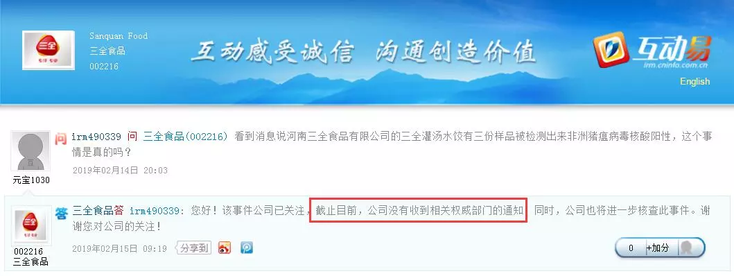 中新經(jīng)緯客戶端報道,14日晚間,有投資者在深交所互動平臺上提問三全食品稱,有消息稱三全灌湯水餃有三份樣品被檢測出非洲豬瘟病毒核酸陽性,該事件是否真實(shí)?