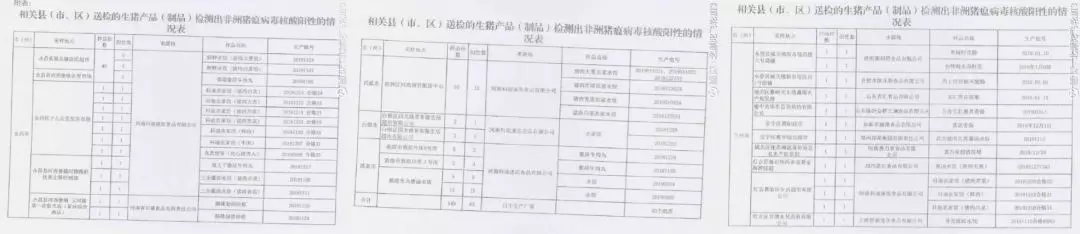 該網(wǎng)友貼出的3張照片顯示為“相關(guān)縣(市、區(qū))送檢的生豬產(chǎn)品(制品)檢測出非洲豬瘟病毒核酸陽性的情況表”,共計11個廠家、40批次產(chǎn)品的83個樣品檢出陽性,采樣地點(diǎn)在甘肅的蘭州市、武陵市、白銀市、酒泉市、金昌市等。被通報的速凍品牌及企業(yè)包括三全、鄭榮、科迪、上海國福龍鳳等,其中標(biāo)稱河南科迪速凍食品有限公司生產(chǎn)的水餃、肉丸等產(chǎn)品,至少有67份樣品檢出非洲豬瘟病毒核酸陽性,為陽性檢出樣品最多的品牌。