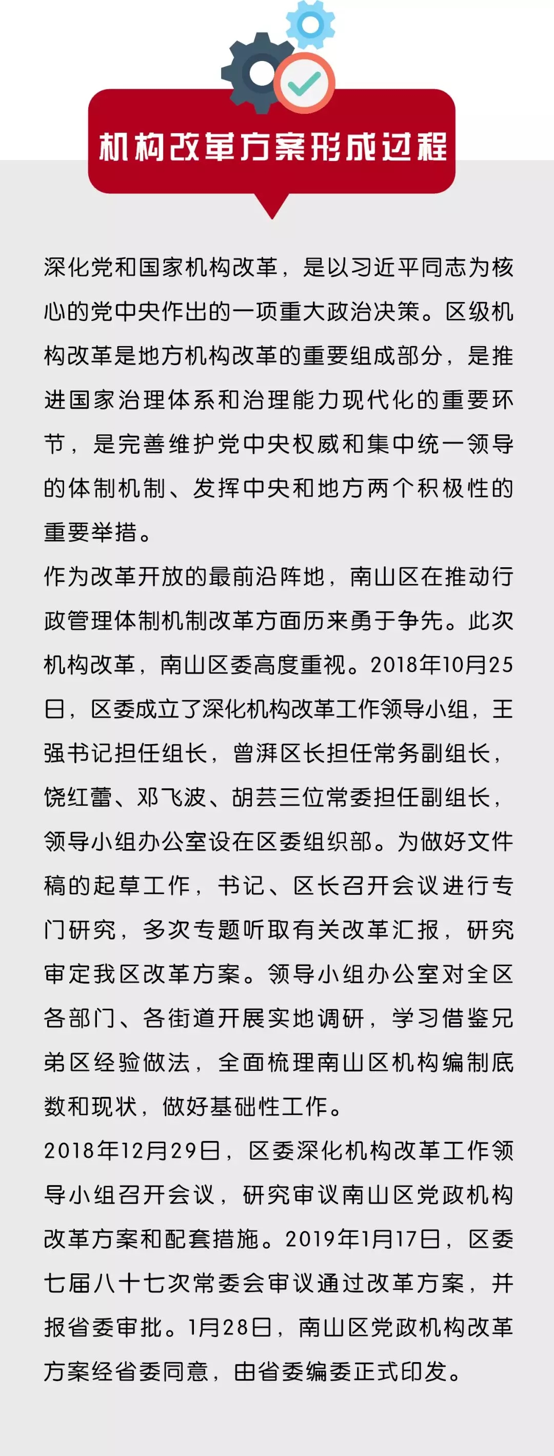 蛇口消息報(bào)2019年2月20日訊 近日,《深圳市南山區(qū)機(jī)構(gòu)改革方案》經(jīng)省委批準(zhǔn),以省委機(jī)構(gòu)編制委員會名義正式印發(fā)。2月20日,南山區(qū)委七屆八次全體會議召開,對全區(qū)深化機(jī)構(gòu)改革工作進(jìn)行動員部署,南山區(qū)機(jī)構(gòu)改革工作進(jìn)入全面實(shí)施階段。