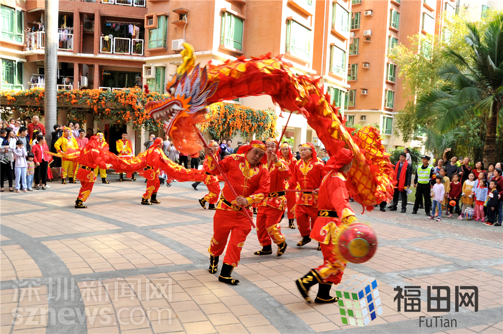 除此之外,巡游隊伍更是會在小區(qū)各個圍合內(nèi)空地上村民進行年俗表演:氣勢如虹的威風鑼鼓、活靈活現(xiàn)的舞龍表演、精彩絕倫的醒獅獻瑞表演。每次表演結(jié)束都收獲了村民如潮水般熱情的掌聲和贊嘆,讓大家驚嘆不已的是這般精彩的表演竟不是來自專業(yè)隊伍而是由管理處員工組成,并在忙碌的工作之余進行排練。