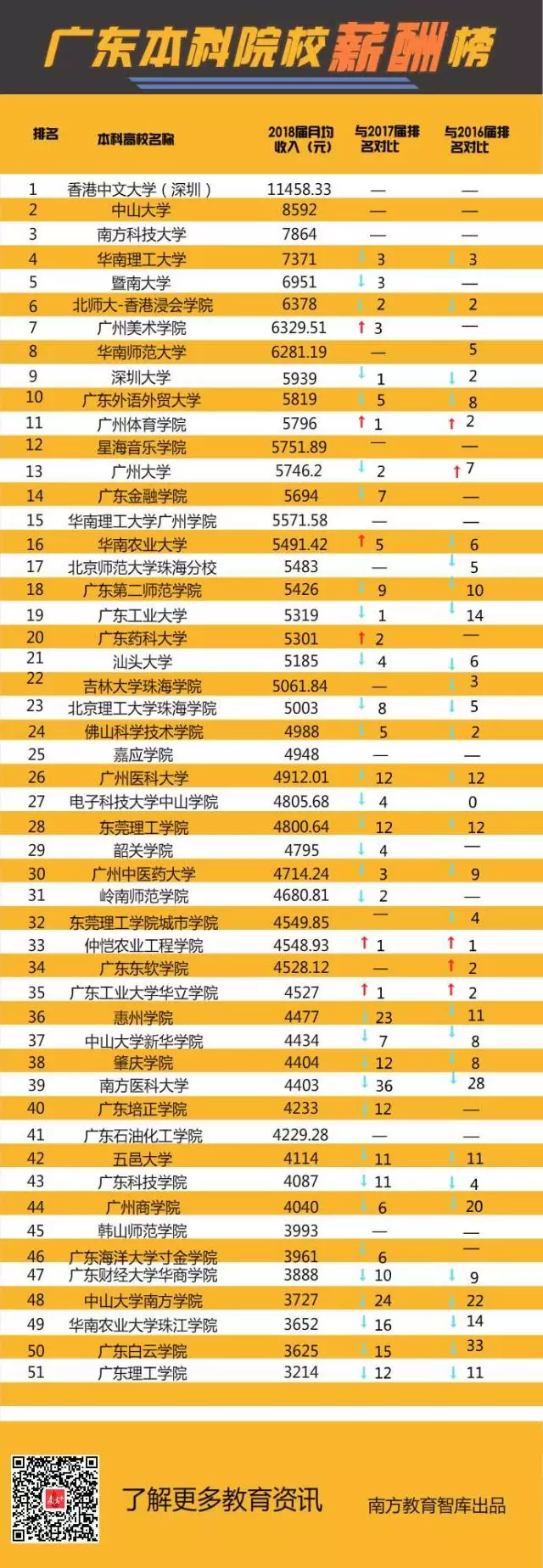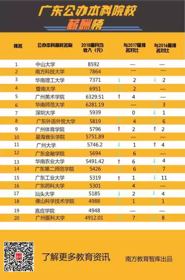 不久前,省教育廳發(fā)布了《2018年高校畢業(yè)生就業(yè)質(zhì)量年度報(bào)告》,全省本科畢業(yè)生平均月薪為4522元。已公布相關(guān)數(shù)據(jù)的51所本科高校中,有35所超過(guò)了全省本科畢業(yè)生的平均月薪,其中中山大學(xué)8592元、南方科技大學(xué)7864元、華南理工大學(xué)7371元名列前3位,均超過(guò)7000元。