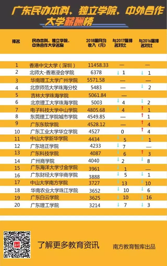 ▲廣東民辦本科、獨(dú)立學(xué)院、中外合作大學(xué)薪酬20強(qiáng),港中文(深圳)成全省首個(gè)平均月薪過(guò)萬(wàn)高校。