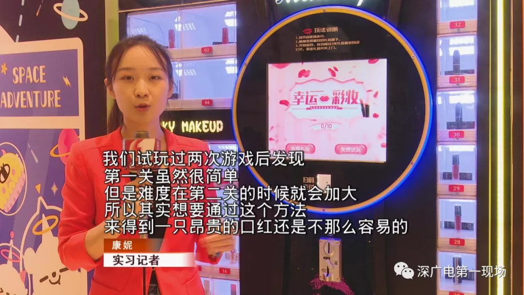 在福田區(qū)的一家商場(chǎng)的醒目位置,擺放著幾臺(tái)口紅機(jī),機(jī)器上有幾十個(gè)透明的小格子,里面都擺放著大牌口紅。但想要得到口紅,就得先玩游戲,游戲一共有三關(guān)。依托于一個(gè)糖果轉(zhuǎn)盤(pán),每關(guān)糖果旋轉(zhuǎn)的速度都會(huì)提高一些,只有全部通關(guān)之后,才能拿到心儀的口紅。