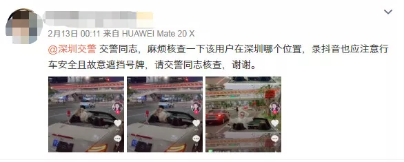 2月13日凌晨,深圳交警接到一名網友舉報,稱有人在路邊拍視頻還遮擋號牌。