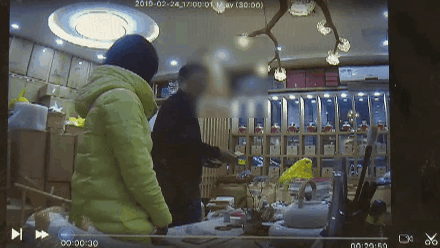 秦女士告訴記者,其實此時錢已經(jīng)被掉包了。從監(jiān)控視頻中可以發(fā)現(xiàn),這位顧客在秦女士去冰柜拿茶葉,小娟在檢查第一張100元時,疑似從外套里拿出了一張假幣壓在了錢包底下。