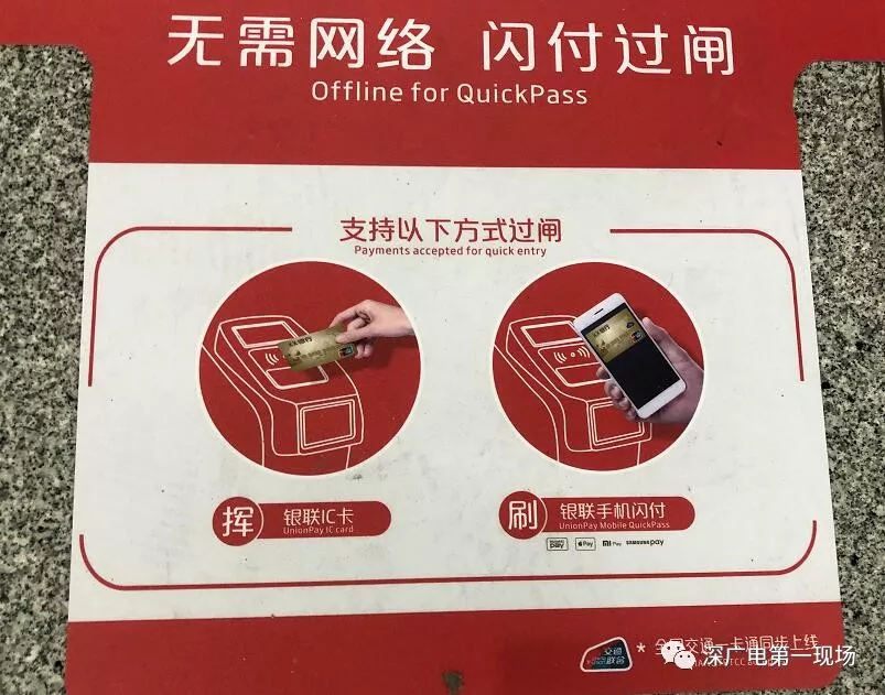 記者了解到,深圳市地鐵已全面受理金融IC卡及銀聯閃付,金融IC卡指的是各銀行發(fā)行的印有銀聯標識及閃付“QuickPass”標識的芯片銀行卡(包括借記卡和信用卡);銀聯閃付支持HuaweiPay、ApplePay、SamsungPay、MiPay等各種手機Pay,消費者無需解鎖手機和打開APP,即可完成支付。市民在地鐵站內貼有“銀聯閃付”、“全國交通一卡通”標識的閘機前,便可直接用金融IC卡、手機刷卡進出站,也可在無網絡的條件下直接用于地鐵過閘。