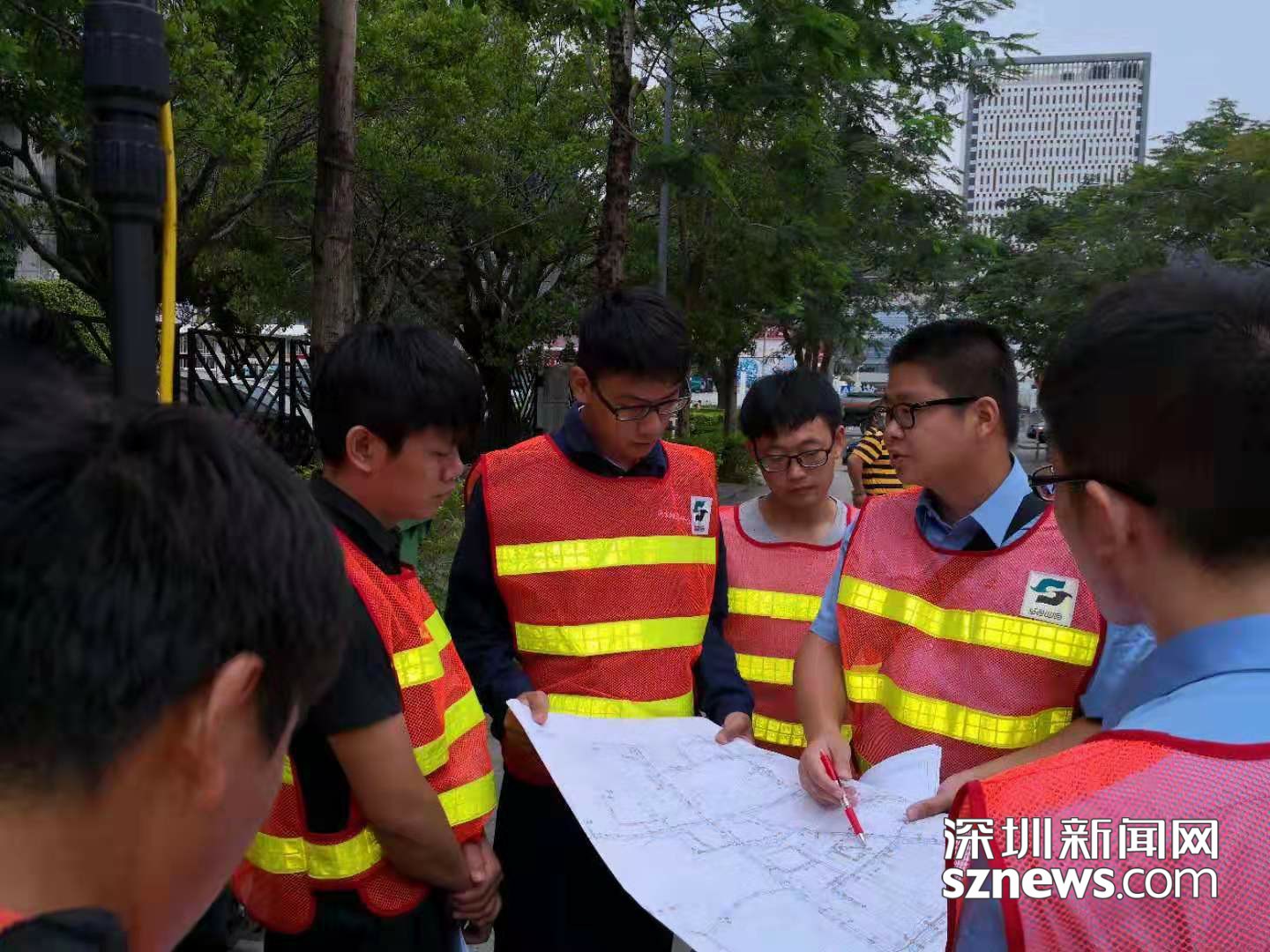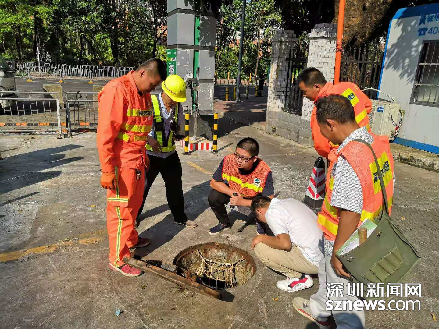圖為王經(jīng)波(后左一)和他的團隊完成排水口排查后