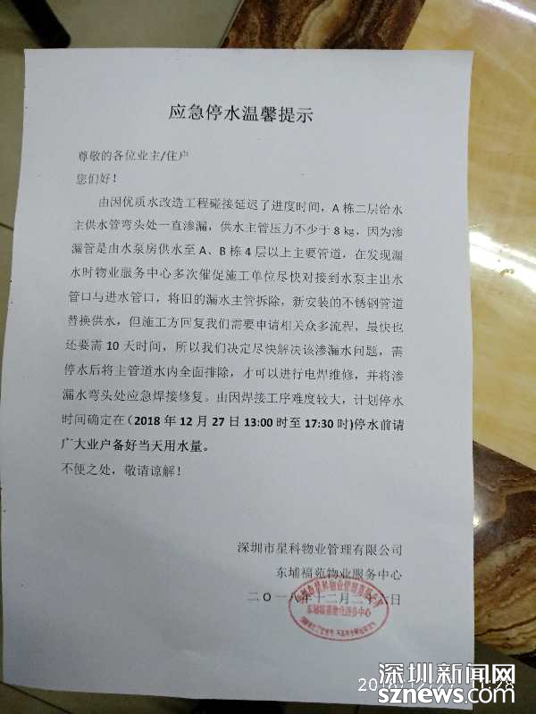 據(jù)了解,自本網(wǎng)報(bào)道此事件后,沙頭角街道便聯(lián)動?xùn)|埔福苑小區(qū)物業(yè)公司于2018年12月26日發(fā)布小區(qū)應(yīng)急停水公告。公告表示,將盡快解決供水管漏水問題,在停水后將主管道水內(nèi)全面排除,進(jìn)行電焊維修,并在滲漏水彎頭處應(yīng)急焊接修復(fù)。為保障施工順利進(jìn)行,小區(qū)停水時(shí)間為:2018年12月27日13:00至17:30。