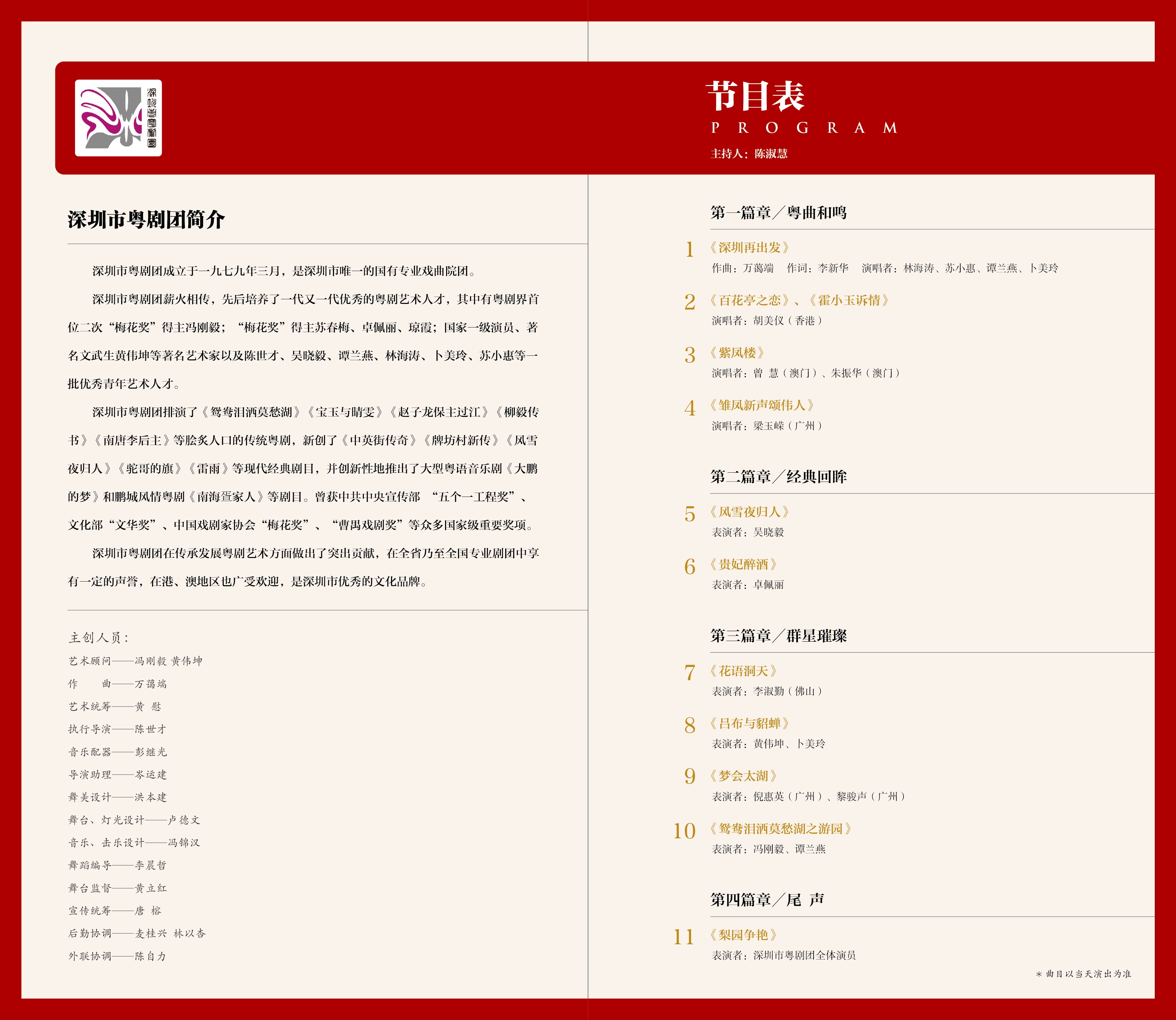 據(jù)悉,晚會(huì)劇目既有深圳粵劇團(tuán)原創(chuàng)經(jīng)典粵劇唱段,也有粵劇粵曲傳世名段,還有新創(chuàng)的現(xiàn)代和現(xiàn)實(shí)題材唱段。一首粵曲聯(lián)唱《深圳再出發(fā)》表達(dá)了藝術(shù)家們對(duì)深圳這座城市無(wú)限的熱愛和不變的情懷,唱響了整場(chǎng)演出的前奏;著名粵曲藝術(shù)家梁玉嶸經(jīng)典作品《雛鳳新聲頌偉人》,用優(yōu)美的曲調(diào)和真實(shí)的情感,歌頌偉人鄧小平的豐功偉績(jī);更有香港、澳門、廣州、深圳、佛山多地粵劇藝術(shù)家的拿手好戲:《夢(mèng)會(huì)太湖》(倪惠英、黎駿聲主演)、《鴛鴦淚灑莫愁湖之游湖》(馮剛毅、譚蘭英主演)、《花語(yǔ)洞天》(李淑琴主演)、《貴妃醉酒》(卓佩麗主演)、《呂布與貂蟬》(黃偉坤、卜美玲主演)、《風(fēng)雪夜歸人》(吳曉毅主演)等戲迷們耳熟能詳?shù)慕?jīng)典曲目精彩呈現(xiàn)?;泟∨c粵曲、經(jīng)典與現(xiàn)代交相輝映,豪情鋪展新一輪深化國(guó)有文藝院團(tuán)改革后呈現(xiàn)出的欣欣向榮。