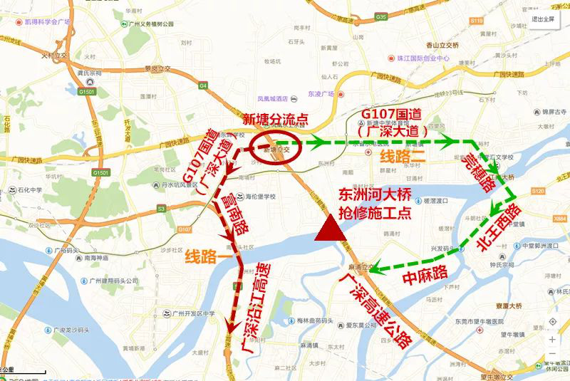 (2)廣深高速公路深圳方向新塘出口→ G107國道(廣深大道)→莞穗路→北王西路→中麻路→廣深高速公路麻涌站入口→東莞、深圳。