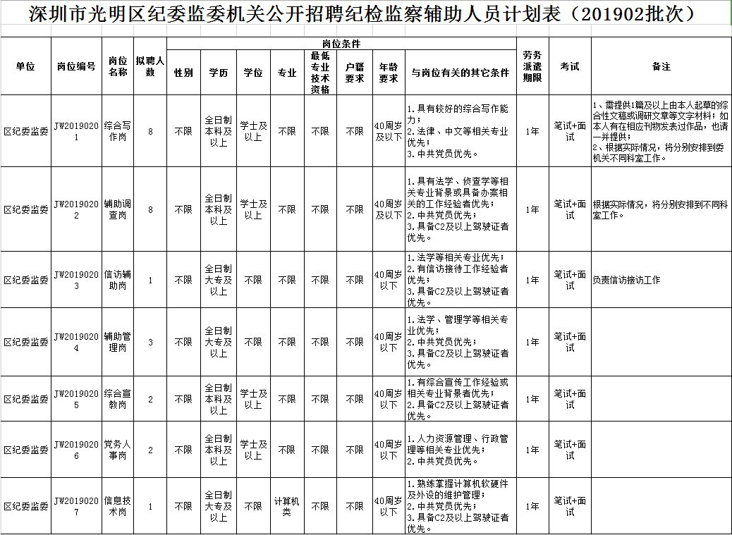 招聘崗位、人數(shù)詳見《深圳市光明區(qū)紀委監(jiān)委機關(guān)公開招聘紀檢監(jiān)察輔助人員計劃表(201902批次)》(文末點擊鏈接可查看)。