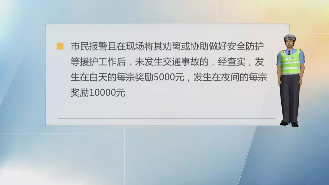 第三種則是市民報警且在現(xiàn)場將其勸離或協(xié)助做好安全防護等援護工作后,未發(fā)生交通事故的,經(jīng)查實,發(fā)生在白天的每宗獎勵5000元,發(fā)生在夜間的每宗獎勵10000元。