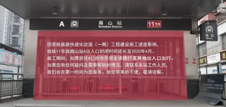 乘客們也請注意:11號線南山站A出入口延長封閉時(shí)間至2020年4月