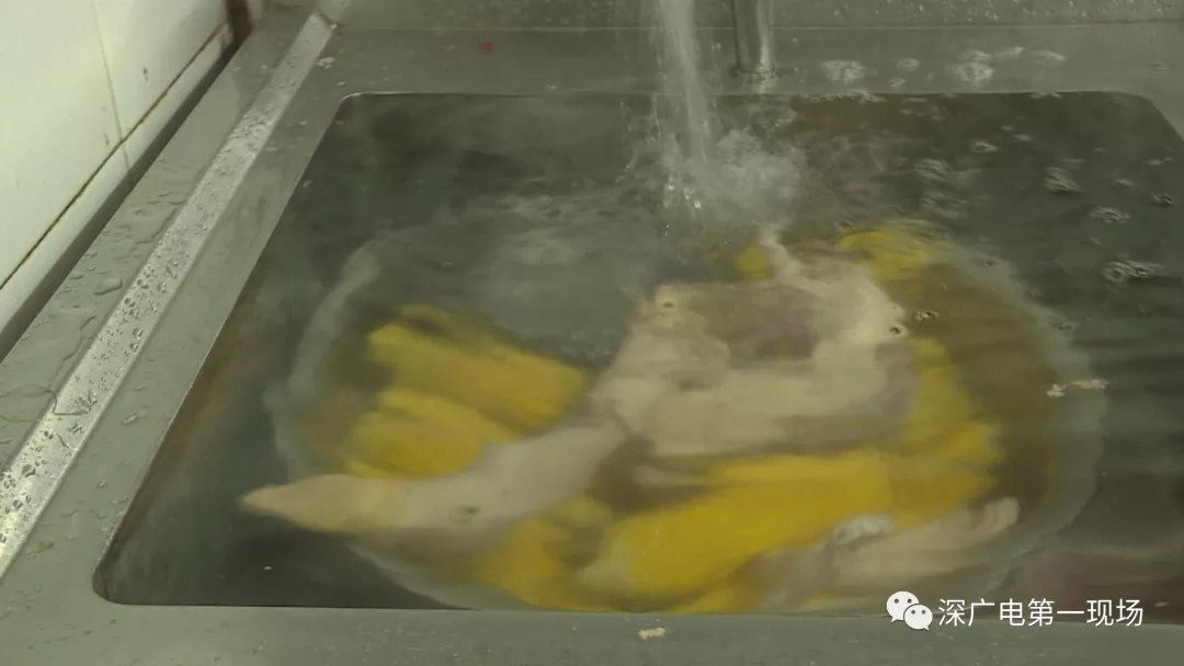 在水產(chǎn)品專用水池,廚工在一個(gè)池子在宰殺著牛蛙,但一旁的池子卻泡著鴨子和玉米。