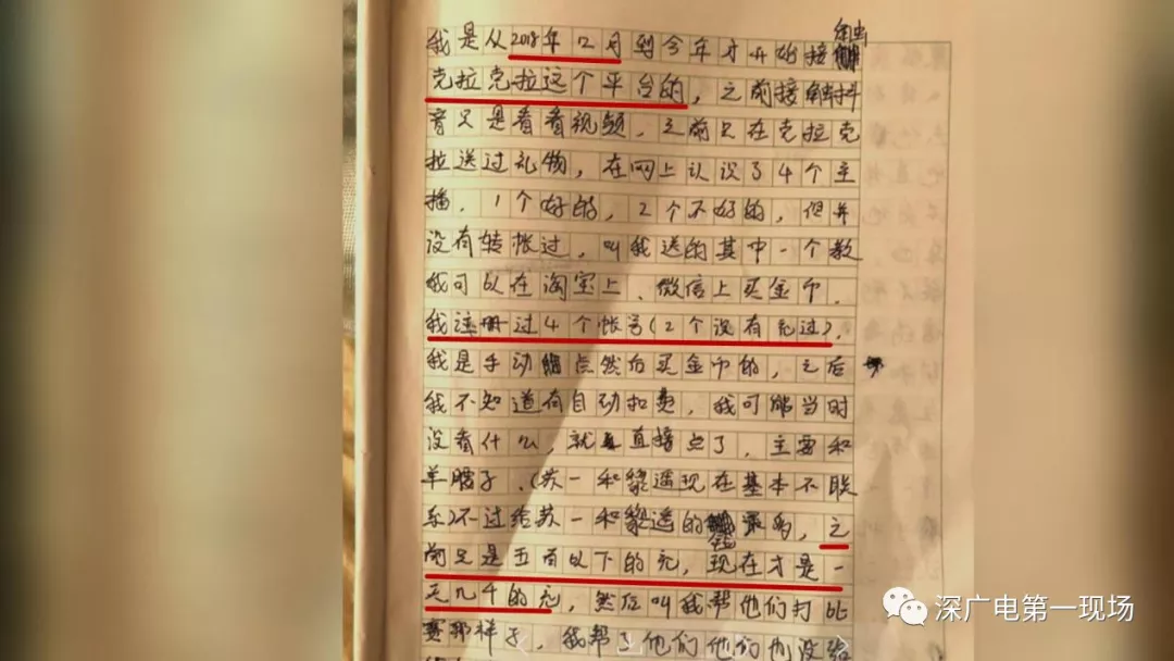洋洋的媽媽說(shuō),發(fā)現(xiàn)自己的女兒刷掉了200萬(wàn),就要求女兒寫(xiě)了一份檢討書(shū)。洋洋在檢討書(shū)上說(shuō),除了平時(shí)在平臺(tái)上進(jìn)行互動(dòng),主播還跟自己加了微信好友,平時(shí)對(duì)自己特別關(guān)心,聊天的內(nèi)容好像關(guān)系很密切,說(shuō)的話也都推心置腹一般,其中一個(gè)主播還說(shuō)了,要和洋洋共同自殘?!