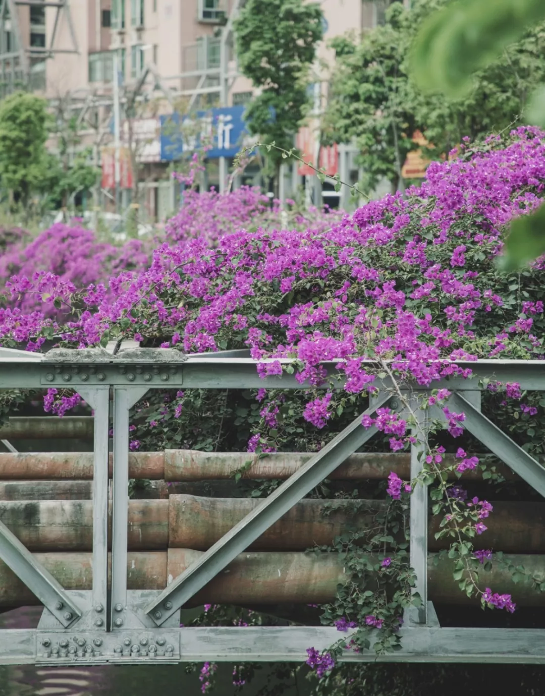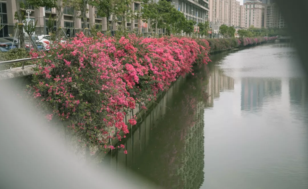 經過寶安人不懈的努力,西鄉(xiāng)河已不見了黑臭的身影,此時盛開的紅色、紫色勒杜鵑清晰地倒映在河面上。