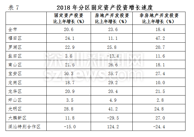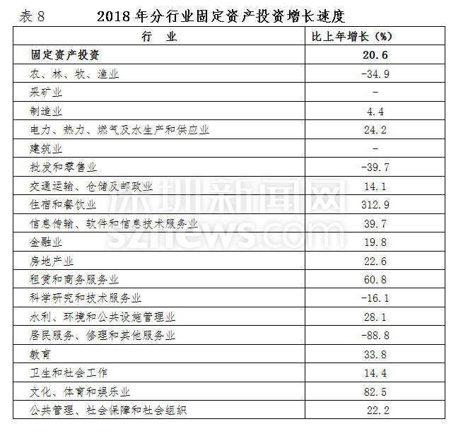 2018年,深圳全市固定資產投資比上年增長20.6%。其中,房地產開發(fā)投資增長23.6%;非房地產開發(fā)投資增長18.4%。分投資主體看,國有經濟投資增長36.7%;民間投資增長12.5%;港澳臺商經濟投資下降22.6%;外商經濟投資增長30.3%。