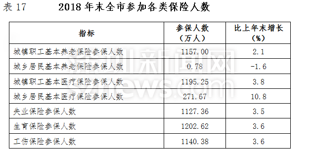 年末全市有1157.00萬人參加了城鎮(zhèn)職工基本養(yǎng)老保險,1127.36萬人參加了失業(yè)保險。