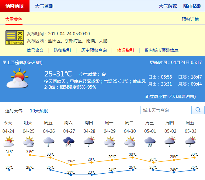 深圳新聞網(wǎng)2019年4月24日訊 深圳市氣象局預(yù)計(jì)24日多云,中午前后悶熱,早晚有輕霧或霧,氣溫25-31℃;25-26日多云,局地有短時(shí)陣雨或雷陣雨;26日夜間至28日有一次雷雨過(guò)程,局地有大到暴雨。