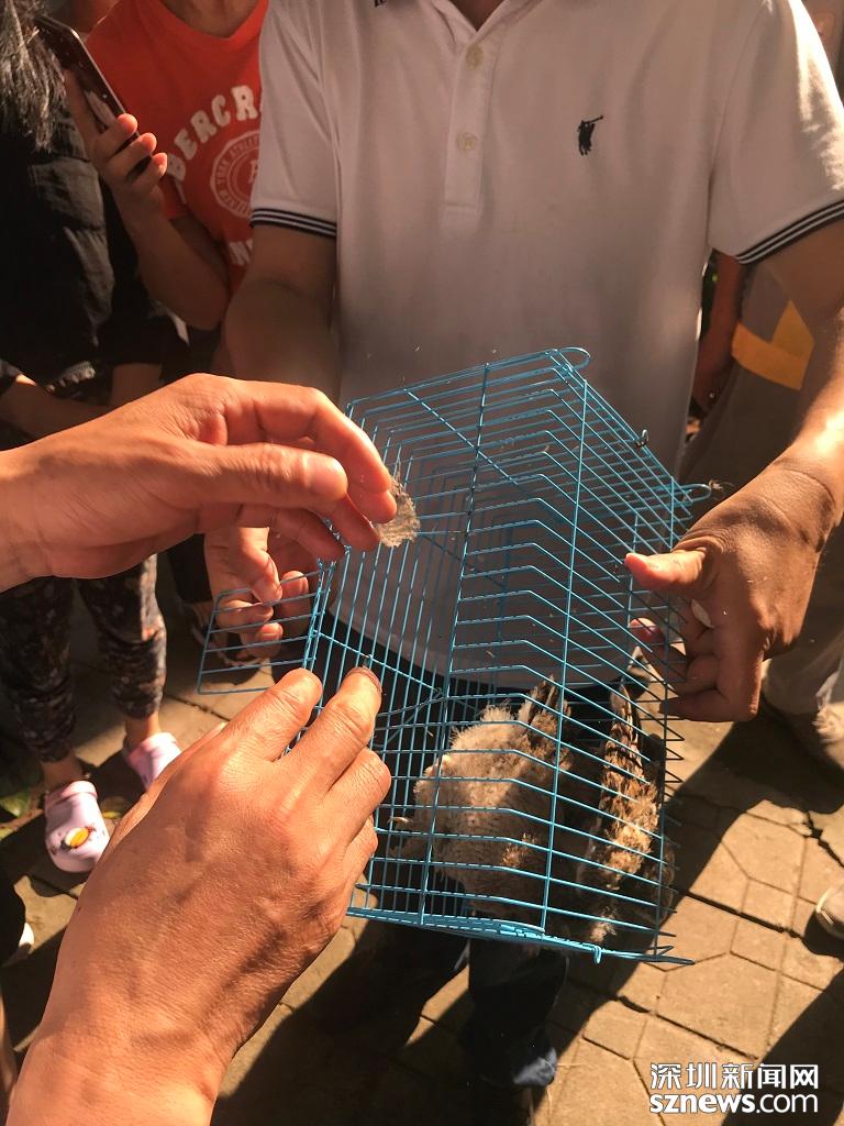 小區(qū)保安先把小貓頭鷹裝進(jìn)籠子,等待動(dòng)保所的工作人員到來。深圳新聞網(wǎng)記者 施翔東 攝
